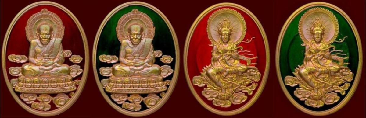เหรียญหลวงปู่ทวดและเหรียญพระโพธิสัตว์กวนอิม รุ่น "หมื่นปี" เนื้อพิเศษลงยาแดงและลงยาเขียว