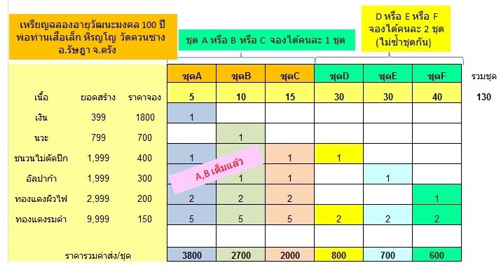 ตอนนี้ชุด A,B และ C ยอดจองเต็มไปแล้วนะคะ เหลือแค่ชุด D,E และ F ค่ะ ส่งจองได้ท่านละ 2 ชุด(ไม่ซ้ำชุดกัน) โอนเงินเพื่อสั่งจองบูชาภายใน 3 วัน รับพระปลายเดือน ตค.56 นี้ รุ่นนี้จองไม่นานค่ะ ท่านใดที่โทรมาจองใว้แล้วขอออนุญาติแบ่งปันให้ท่านอื่นด้วยค่ะ...