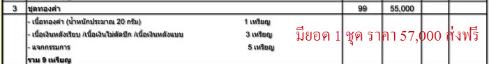 รายการที่ 3 ชุดทองคำ รับพระ 9 เหรียญ รวมทั้งเนื้อทองคำ นน.ประมาณ 20 กรัม จำนวนการสร้าง 99 ชุด เปิดจอง จำนวน 1 ชุด ราคา 57,000 บาท