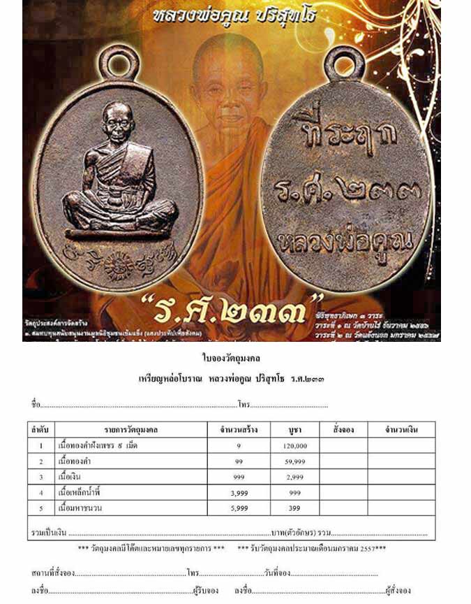 เหรียญหล่อโบราณ หลวงพ่อคูณ ปริสุทโธ ร.ศ.๒๓๓ ชุดเหรียณทองคำคับมีมาให้1 ชุดคับ 79,000 บาท แต่ถ้าสนใจปิดภายใน 48 ชั่วโมงมีลดให้แต่ต้องโทรมาคุยหรือจองไว้ครับ(โอนแล้วมีผลทันทีครับ)ใบจองนะครับ