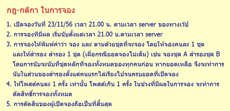 ขอให้โชคดีครับทุกท่าน หลังจากการจองเสร็จสิ้นจะสรุปและแจ้งให้ทราบในกระดานประชาสัมพันธ์พระเครื่องครับ
