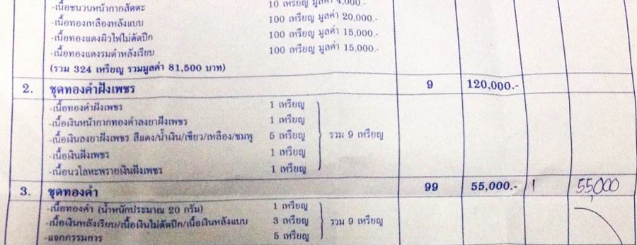 - เนื้อทองคำ (น้ำหนักประมาณ 20 กรัม) 1 เหรียญ