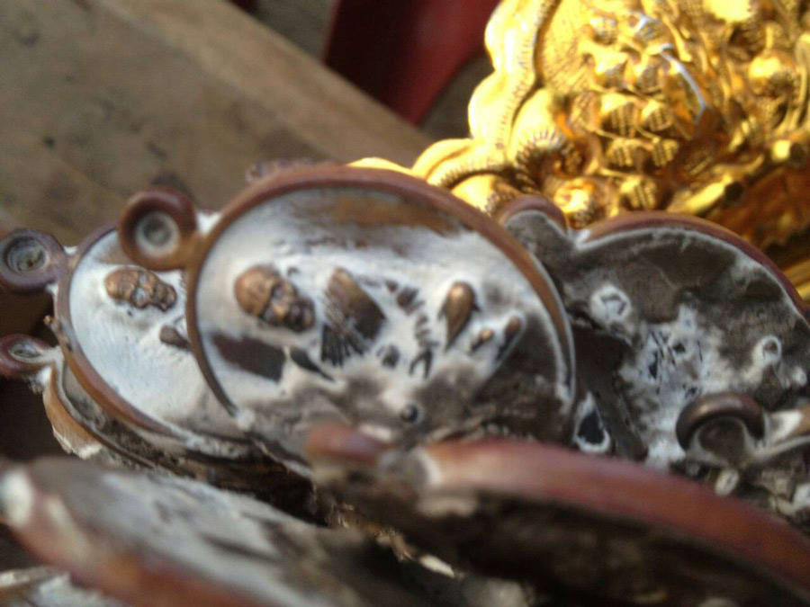 เหรียญหล่อ เนื้อทองฝาบาตร แช่นํ้ามนต์ มี 5 เหรียญ เปิด 550 บาท / เหรียญ