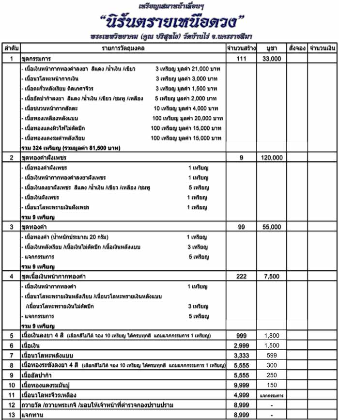- เนื้อทองคำ (น้ำหนักประมาณ 20 กรัม) 1 เหรียญ