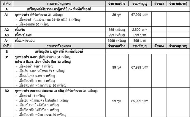 - เหรียญปั๊มปาฏิหาริย์ พิมพ์ครึ่งองค์ เนื้อเงิน 1 เหรียญ + เนื้อทองแดงผิวไฟ 2 เหรียญ + เนื้อทองแดงรมดำ 2 เหรียญ + เนื้อทองแดงมันปู 2 เหรียญ ชุดละ 3,300 บาท มี 1 ชุด