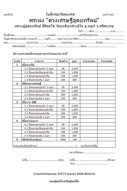 รวมสุดยอดมวลสาร เพื่อสืบสานตำนาน แห่งพระผงดวงเศรษฐี หลวงปู่หมุน ที่นับวันจะหายากและเป็นที่นิยมขึ้นและเป็นที่ปรารถนาของลูกศิษย์หลวงปู่หมุน ท่านอาจารย์หมัน วัดป่าช่องกุ่ม ซึ่งเป็นลูกศิษย์ยุคแรกๆท่านหนึ่งของหลวงปู่หมุน ที่คอยรับใช้หลวงปู่ เป็นหัวเรี่ยวหัวแรงและอยู่เบื้องหลังหลังงานพิธีพุทธาภิเษกต่างๆแทบทุกพิธีของหลวงปู่หมุนและเป็นศิษย์ผู้น้องของท่านหลวงปู่อุดมทรัพย์ ในการนี้ท่านมีความคิดที่จะจัดสร้างรูปเหมือนหลวงปู่หมุนขนาดเท่าองค์จริง จำนวน 16 องค์ เพื่อกระจายไปไว้ที่วัดต่างๆ ที่เกี่ยวข้องกับหลวงปู่หมุน จึงได้ขออนุญาตจากท่าน หลวงปู่อุดมทรัพย์ เพื่อจัดสร้างวัตถุมงคล ที่สืบสานตำนานแห่งพระผงดวงเศรษฐี ที่เต็มเปี่ยมด้วย ประสบการณ์ทางด้าน อุดมโชค โภคทรัพย์ จึงเป็นที่มาแห่งการจัดสร้าง พระผง ดวงเศรษฐีอุดมทรัพย์ โดยท่านหลวงปู่อุดมทรัพย์และท่านอาจารย์หมั่นได้รวบรวมชนวนมวลสารต่างๆ ที่เก็บไว้ในสมัยที่หลวงปู่หมุนยังอยู่และปลุกเสกไว้ให้นำมาผสมกับมวลสารของหลวงปู่ละมัยและผงกสินหลวงปู่สรวง รวมถึงเนื้อพระผงเกจิอาจารย์และผงพระเก่าต่างๆอีกมากมาย นำมาจัดสร้าง พระผง ดวงเศรษฐีอุดมทรัพย์ โดยนำรูปแบบของครูบาอาจารย์คือหลวงปู่หมุนมาจัดสร้าง ซึ่งถือว่าเป็นตำนานจริงๆ เพราะต้องตำนานมากๆ ท่านอาจารย์บอกต้องตำเป็นหมื่นๆสาก มวลสารต่างๆ ท่านอาจารย์หมันท่านตำเองกับมือ ตำไปบริกรรมคาถากำกับไป มะอะอุ อุอะมะ แค่เนื้อพระยังไม่ได้กดพิมพ์ก็สุดยอดแล้ว พระจะเริ่มนำเข้าพิธีปลุกเสกตามวาระต่างหลายพิธี เริ่มต้นพิธีแรก วันที่ 9 ก,พ 58 นี้ที่วัดช่องกุ่มซึ่งมีเกจิอาจารย์ขื่อดังมาร่วมปลุกเสกมากมายและจะทำพิธีปลุกเสกใหญ่ ในวันที่ 9 เม.ย 58 นี้ ที่วัดหนองระกำ จ.ระยอง พระมวลสารสุดยอด จัดสร้างจำนวนน้อย บางรายการ เหลือน้อยแล้ว รีบสั่งจอง ครับ
