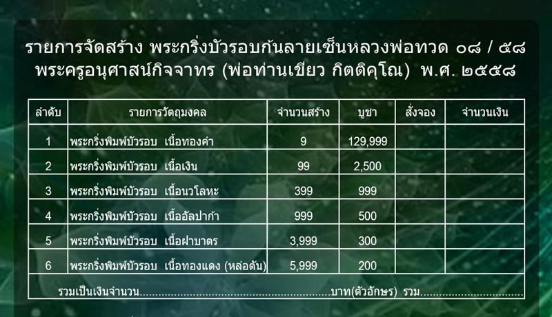 | หัวข้อกระทู้ : หลวงพ่อทวด " พระกริ่งพิมพ์บัวรอบก้นลายเซ็นต์ " พ่อท่านเขียว กิตติคุโณ ราคาจองทุกรายการครับ |