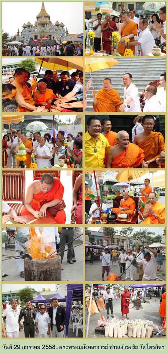 วันที่ 29 มกราคม 2558..พระพรหมมังคลาจารย์ ท่านเจ้าธงชัย วัดไตรมิตร กรุงเทพ..ประธานเททองหล่อ...พระกริ่งชินบัญชรธงชัยนวะหรคุณ..อาจารย์ชินพร สุขสถิตย์..ศิษย์พุทธคมหลวงปู่ทิม วัดระหารไร่..ประธานบวงสรวง...สร้างถวาย..มีเนื้อทองคำ นวะ..หลวงพ่อนนท์ สำนักสงฆ์เขาพรานธูป อำเภอหัวหิน จังหวัดประจวบ..สืบสานตำนานปลัดขิก...ลอยได้จากหลวงพ่อยิด วัดหนองจอก กุยบุรี ประจวบ....พรหมน้ำมนต์ที่เตาหลอม..นั่งปรก..หลวงพ่อเขียว วัดห้วยเงาะ ปัตตานี..พระอาจารย์มหาสุรศักดิ์ วัดประดู่ สมุทรสงคราม..พระอาจารย์แป๊ะ วัดสว่างอารมย์ นครปฐม...เวลา 13.29..ณ. วัดไตรมิตร กรุงเทพ