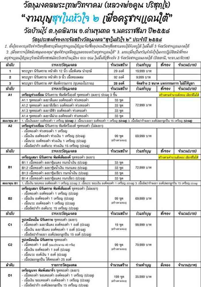 1. พระบูชา นิรันตราย หน้าตัก 9 นิ้ว เนื้อทองผสม สร้าง 92 องค์ = 1 องค์