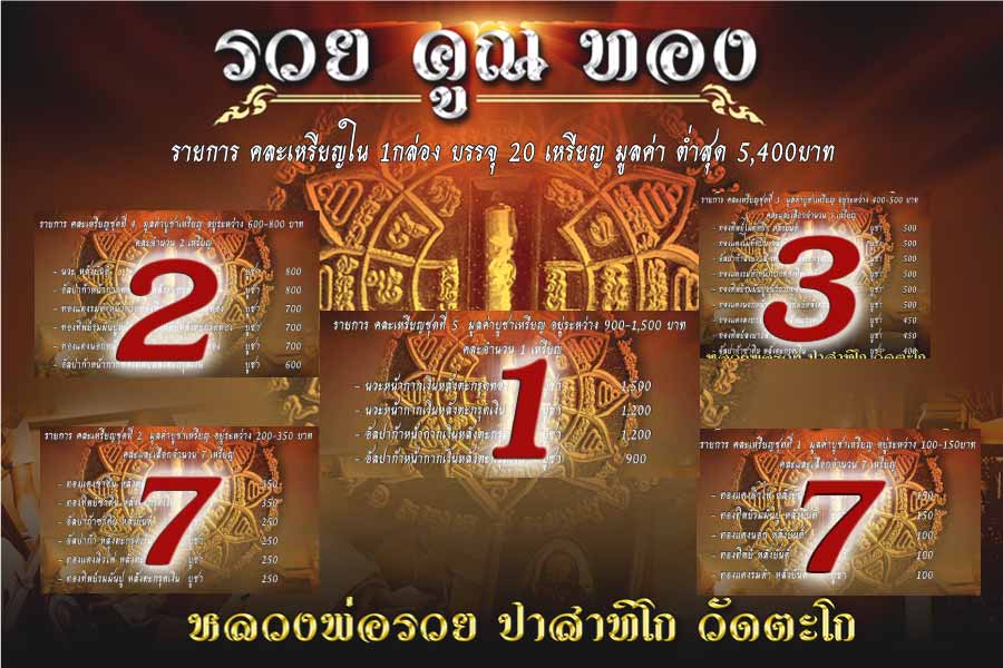 ประกอบด้วย เหรียญต่างๆคละเนื้อโดยสุ่มบรรจุจำนวน 20 เหรียญ ได้รับเหรียญมูลค่ารวมต่ำสุด 5400 บาท หรือ มีสิทธิ์ลุ้นเหรียญเนื้อเงิน และเนื้อพิเศษชนิดต่างๆ