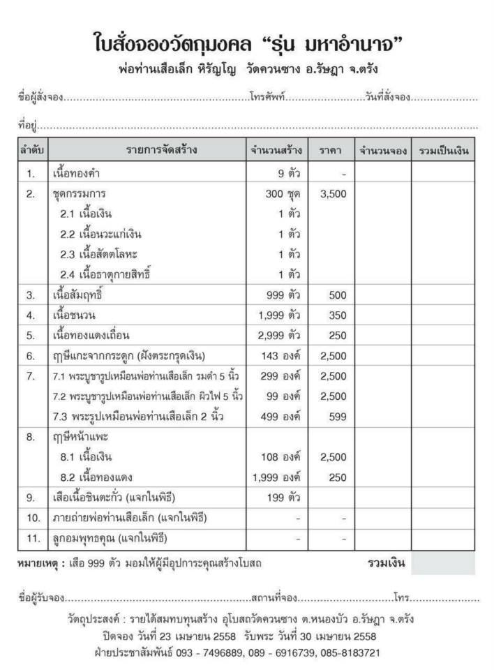 4. เนื้อชนวน จำนวนสร้าง 1,999 ตัว จองตัวละ 350 บาท