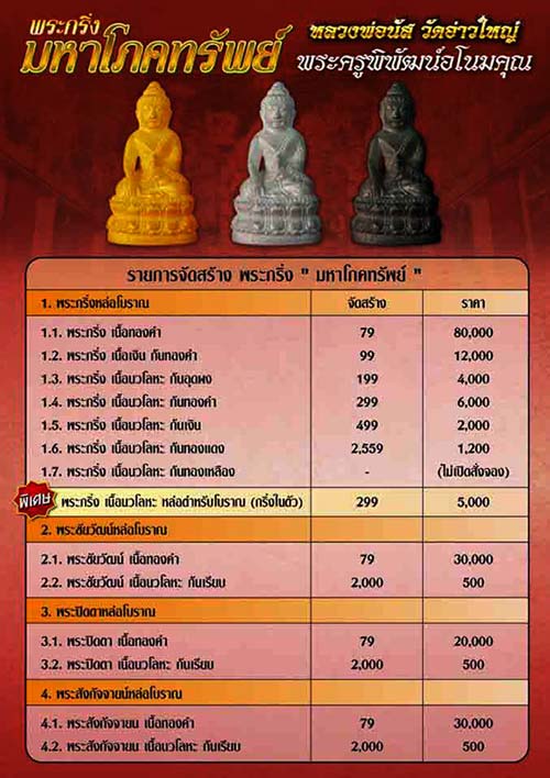 พระชุดนี้หล่อโดยพี่ชินพรและพี่ขุน เป็นช่างที่ทำสุดยอดพระกริ่งคือ พระกริ่งชินบัญชร หลวงปู่ทิม เมื่อปี ๒๕๑๗ พระกริ่งมงคลมหาเศรษฐี หลวงปู่บัว เมื่อปี ๒๕๕๒ และพระกริ่งประทุมสุริยะวงศ์ ของก๋งเตื่อง เมื่อปี ๒๕๕๕ ซึ่งพระทั้งหมดนี้เป็นที่รู้จักดีของสมาชิกที่สะสมพระเครื่องสายตะวันออก และปัจจุบันราคาสูงมาก