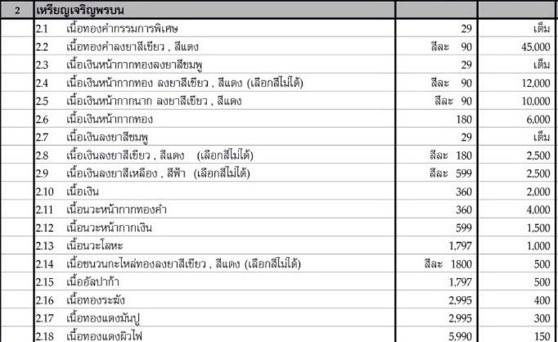 2.2 เนื้อทองคำลงยาสีเขียว,สีแดง มีจำนวนสีละ 1 เหรียญ เหรียญละ 45,000.- บาท