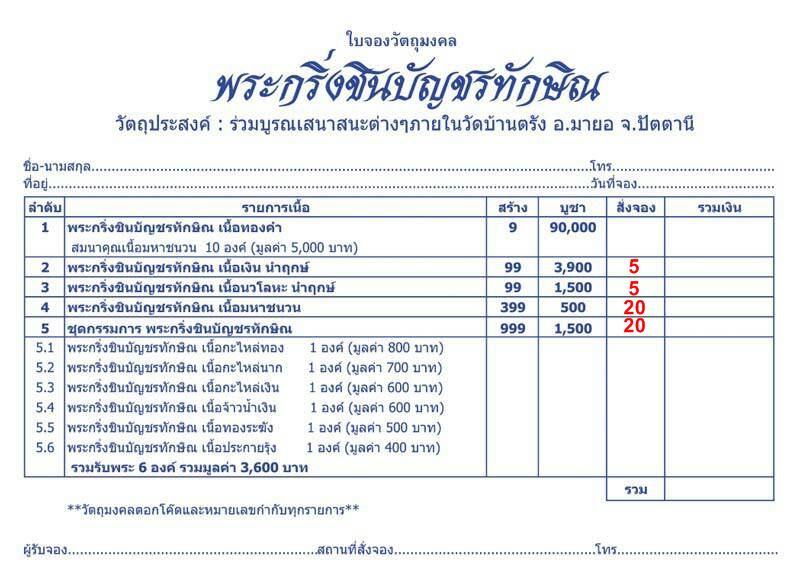 เปิดจองพระกริ่งชินบัญชรทักษิณ และขุนแผนพ่อครูโนราห์ พ่อแก่เจ้าแสง วัดบ้านตรัง อ.มายอ จ.ปัตตานี