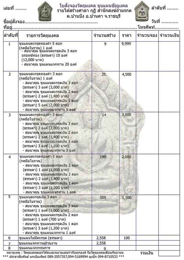 หมายเหตุ ทุกท่านที่ร่วมทำบุญ โอนเงินภายใน 1 วันหลังทำการสั่งจอง ขอบคุณครับ