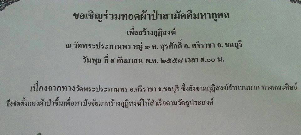 เชิญร่วมบุญผ้าป่าสามัคคี สมทบทุนสร้างกุฏิสงฆ์ วัดพระประทานพร อ.ศรีราชา จ.ชลบุรี