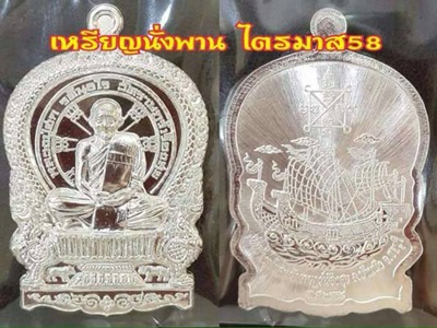 มียอดเหรียญนั่งพานสำเภาทอง(ไตรมาส ๕๘) หลวงปู่ฮก รตินธโร วัดราษฏร์เรืองสุข (มาบบิด) เนื้อ นวะหน้าเงิน 1 เหรียญ ราคา 3800 บาท
