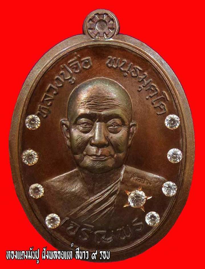 9.4 ทองแดง มันปู ฝังพลอยแท้ ๙ รอบ ไม่ตัดปีก หลังเรียบ (น้ำเงิน ,เหลือง ,ขาว ,เขียว ,แดง ,ม่วง สีละ 66 เหรียญ) เหรียญละ 800 บาท มียอด 2 เหรียญ