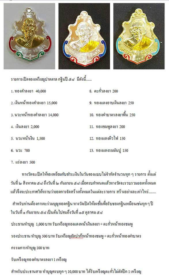 ทางวัดจะเปิดให้จองไม่จำกัดจำนวนทุกรายการตั้งแต่วันที่ 2 สิงหาคม 2558 ถึงวันที่ 2 กันยายน 2558 ผมจะเดินทางไปจอง วันที่ 1 กันยายน 2558 เพื่อจะไปลงชื่อรับซองกฐินของวัดด้วย ถ้าท่านใดจะฝากจองพระหรือฝากลงชื่อรับซองกฐิน ฝากได้ไม่จำกัดจำนวน โดยขอค่าเดินทางให้ผมท่านละ100บาท ส่วนค่าจัดส่งคำนวนตามน้ำหนักของไปรษณี ท่านใดสนใจให้ลงชื่อและบอกยอดการฝากจองไว้ก่อน ยังไม่ต้องโอนเงินมานะครับ ให้โอนเงินในวันที่ 30 สิงหาคม 2558 นะครับ ชื่อบัญชี นายวิทยา มณีสาย เลขที่บัญชี 578-2-12092-3 ธนาคารกสิกรไทย ออมทรัพย์ สาขาศาลายา |