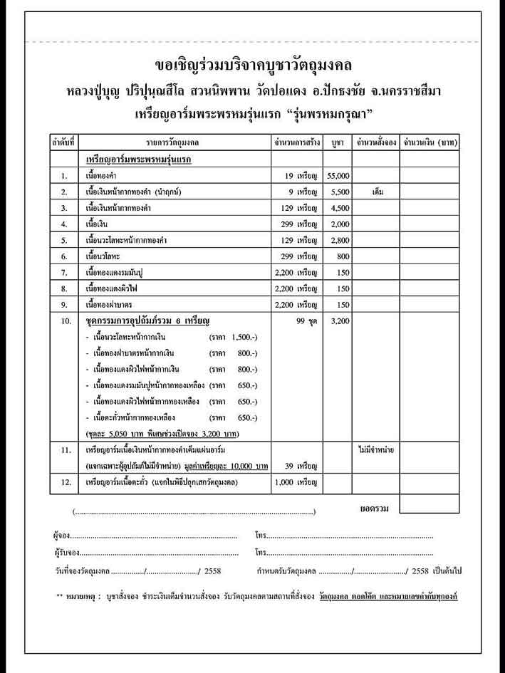 รายการที่เปิดจองเหรียญอาร์มพระพรหมรุ่นแรกดังนี้
