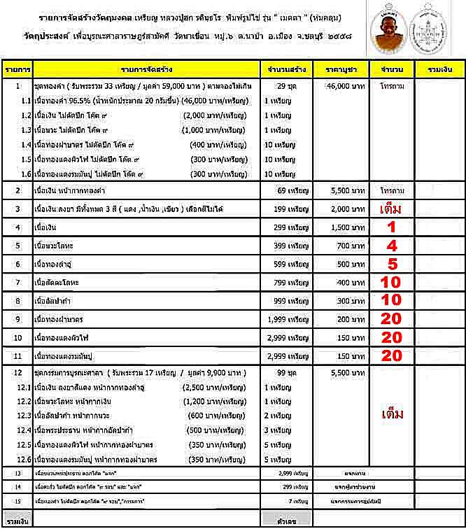 รายการและจำนวนที่เปิดให้จองตามตารางครับ สนใจรายการไหนลงแจ้งการจองในกระทู้ได้เลยครับ บุคคลภายนอกที่ไม่ได้เป็นสมาชิกเว๊ป สั่งจองทางโทรศัพท์ได้ครับ