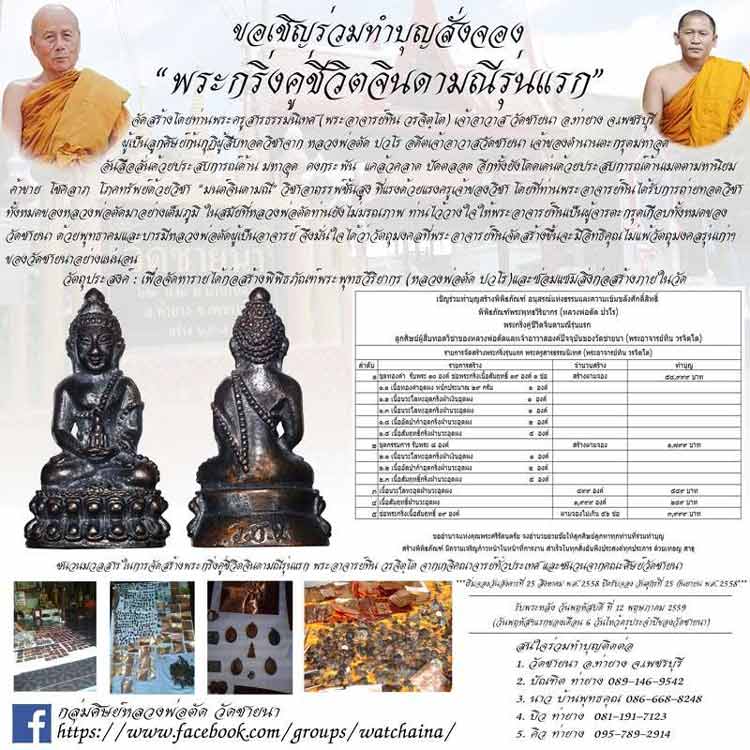 วัตถุประสงค์ : เพื่อจัดหารายได้ก่อสร้างพิพิธภัณฑ์พระพุทธวิริยากร (หลวงพ่อตัด ปวโร) และซ่อมแซมสิ่งก่อสร้างภายในวัดชายนา