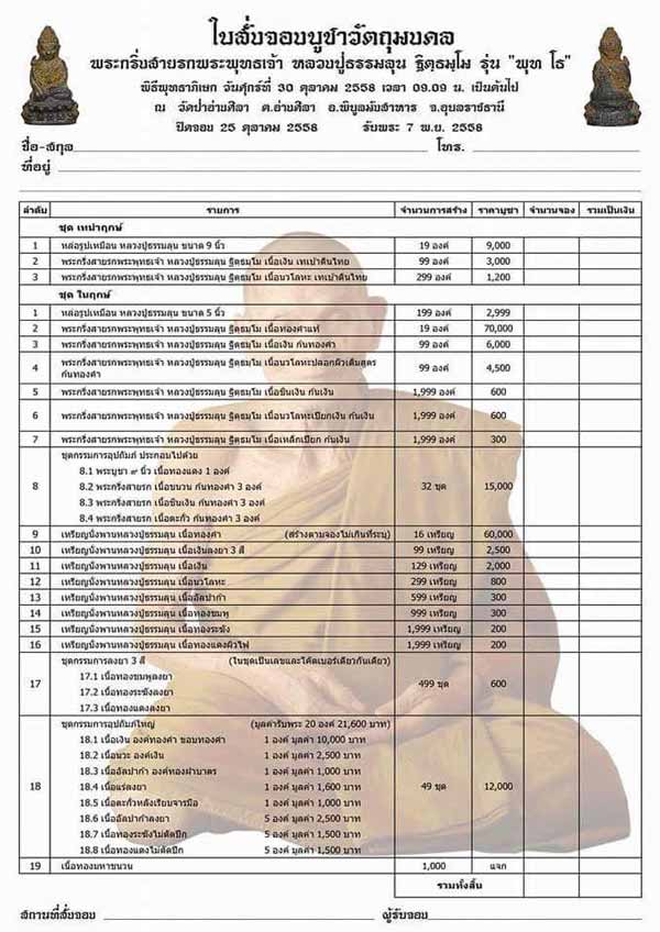 เปิดจอง หลวงปู่ธรรมลุน รุ่นพุทโธ พิธีพุทธาพิเษก วันศุกร์ที่ 30 ตุลาคม 2558 ณ.วัดป่าอ่างศิลา จ.อุบลราชธานี ต้องการรายการใหน สอบถามได้ครับ มีทุกรายการ