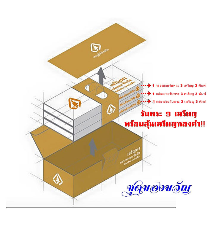 ชุดของขวัญ รับพระ 9 เหรียญ 3 แบบ 3 พิมพ์คละเนื้อ มีโอกาศลุ้นเนื้อหลักๆ เช่น ทองคำ เงินหน้าทองคำ ฯลฯ