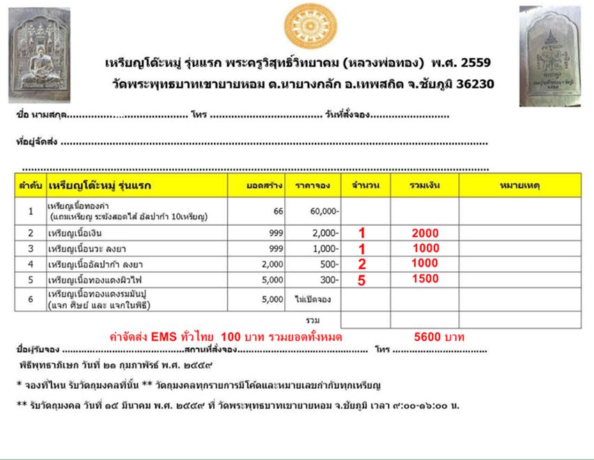 เปิดจองเหรียญโต๊ะหมู่ รุ่นแรก พระครูวิสุทธิ์วิทยาคม(หลวงพ่อทอง) พ.ศ.2559 วัดพระพุทธบาทเขายายหอม จ.ชัยภูมิ