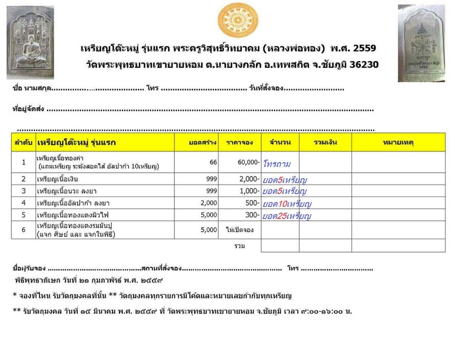 ฉลองเทศกาลปีหม่ ราคาจอง เหรียญโต๊ะหมู่ รุ่นแรกหลวงพ่อทอง วัดพระพุทธบาทเขายายหอม
