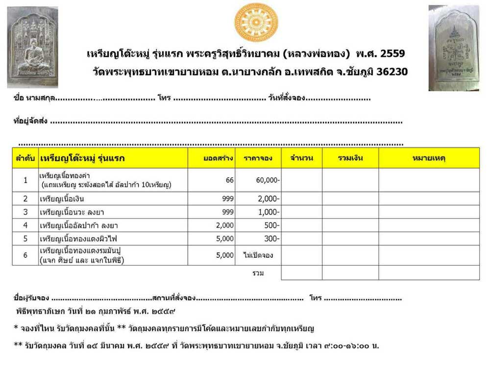 เปิดจองเหรียญโต๊ะหมู่ รุ่นแรก หลวงพ่อทอง วัดพระพุทธบาทเขายายหอม