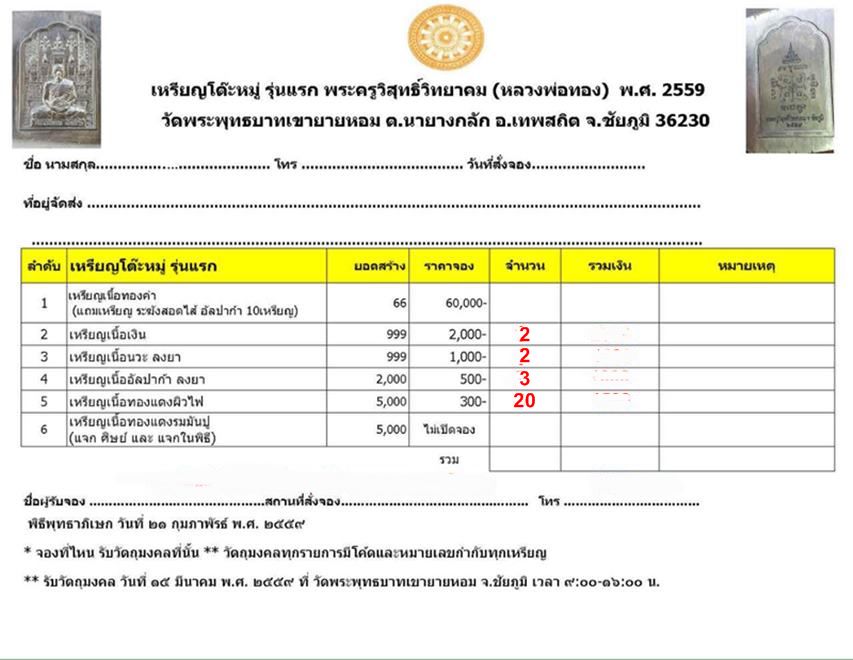 เปิดจองเหรียญโต๊ะหมู่ รุ่นแรก พระครูวิสุทธิ์วิทยาคม(หลวงพ่อทอง) พ.ศ.2559 วัดพระพุทธบาทเขายายหอม จ.ชัยภูมิ