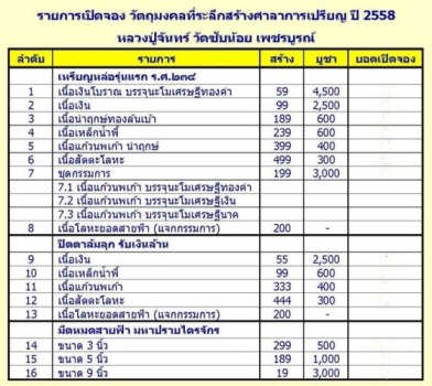รายการวัตถุมงคล หลวงปู่จันทร์ รุ่นสร้างศาลาการเปรียญ