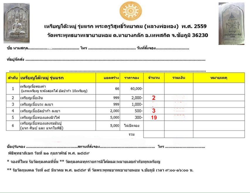 เปิดจองเหรียญโต๊ะหมู่ รุ่นแรก พระครูวิสุทธิ์วิทยาคม(หลวงพ่อทอง) พ.ศ.2559 วัดพระพุทธบาทเขายายหอม จ.ชัยภูมิ