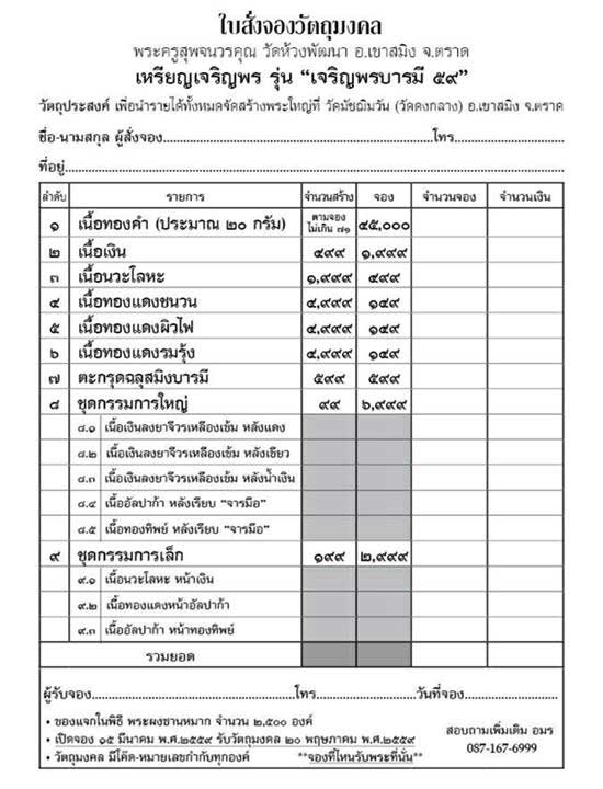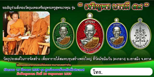 | หัวข้อกระทู้ : เปิดรับจอง "ราคาจอง" เหรียญเจริญพรบารมี 59 (เทพเจ้าแห่งเสือสมิง) หลวงพ่อสุพจนวรคุณ วัดห้วงพัฒนา จ.ตร |