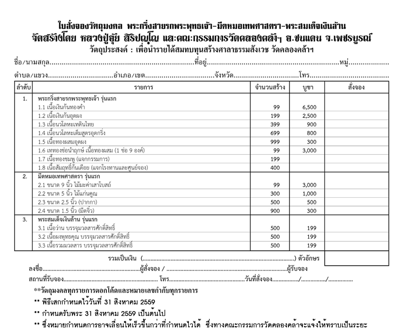 กำหนดวันเสกและรับวัตถุมงคลตามใบรายการจองพระเครื่อง