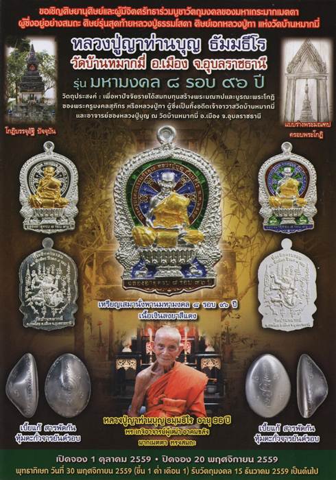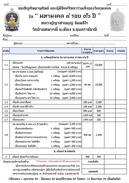 เปิดจอง เหรียญนั่งพาน รุ่น " มหามงคล 8 รอบ 96 ปี" หลวงปู่ญาท่านบุญ วัดบ้านหมากมี่ จ.อุบลราชธานี