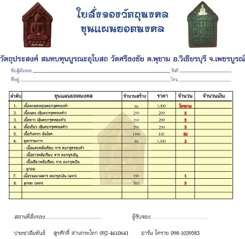 เปิดจองครับ ขุนแผน"ยอดมงคล"ขุนแผนรุ่นแรกที่หลวงพ่อยอดเมตตาอนุญาติให้จัดสร้างรวมทั้งมวลสารผงสมเด็จบล๊อคแตก เกศา จีวร และปลุกเสกเดี่ยวโดยเกจิสายเหนียวแห่งเมืองโคราชหลวงพ่อยอด โกสโล วัดตะคร้อ อ.โนนไทย จ.นครราชสีมา บิลที่ 2 สบทบทุนบูรณะพระอุโสถ วัดศรีธงชัย จ.เพชรบูรณ์ ขอเชิญร่วมบุญกันครับ