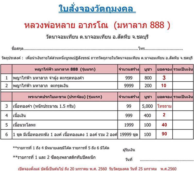 หัวข้อกระทู้ : จอง พญาไก่ฟ้า มหาลาภ 888 และ ปรกใบมะขาม รุ่นแรก หลวงพ่อหลาย วัดนาจอมเทียน จ.ชลบุรี ราคาวัดค่ะ