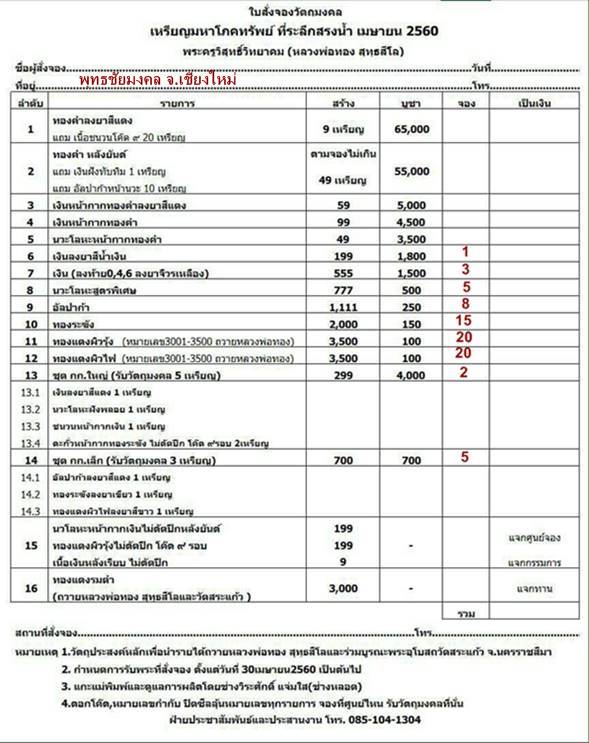 หมายเหตุ : 1.วัตถุประสงค์หลักนำรายได้ถวายหลวงพ่อทอง สุทธสีโลและร่วมสร้างอุโบสถวัดสระแก้ว จ.นครราชสีมา