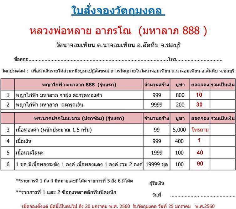 เปิดให้จองโค้งสุดท้าย พญาไก่ฟ้า มหาลาภ 888 และปรกใบมะขาม (ปรกจ้อย) รุ่นแรก หลวงพ่อหลาย วัดนาจอมเทียน อ.สัตหีบ จ.ชลบุรี (ราคาวัดค่ะ)