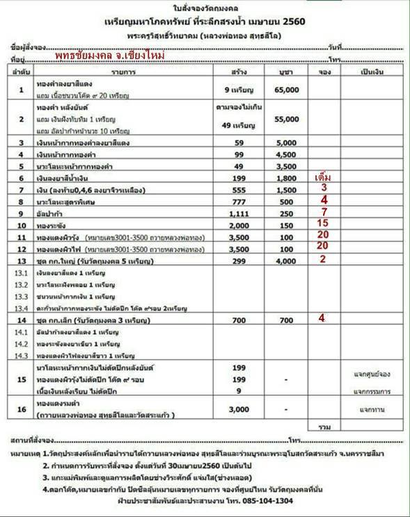 หมายเหตุ : 1.วัตถุประสงค์หลักนำรายได้ถวายหลวงพ่อทอง สุทธสีโลและร่วมสร้างอุโบสถวัดสระแก้ว จ.นครราชสีมา