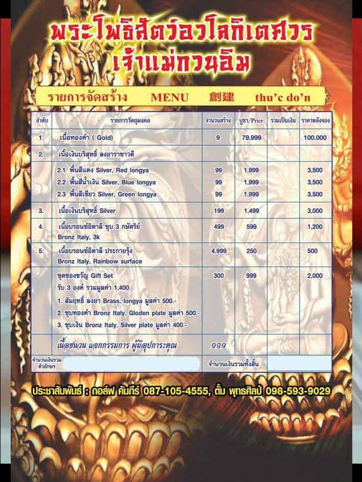 วัตถุประสงค์ : เพื่อร่วมสมทบทุนสร้างศาลาเจ้าแม่กวนอิม องค์ใหญ่