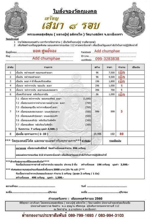 รายการที่ 8 ลุ้นเนื้อ ลุ้นเบอร์สวยๆ จำนวน 80 เหรียญ ราคาจอง 150 บาทต่อเหรียญ