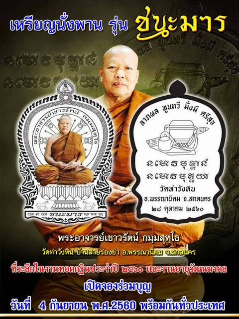 | หัวข้อกระทู้ : เปิดจอง..เหรียญนั่งพาน "ชนะมาร" พระอาจารย์เชาวรัตน์ กมฺมสุทฺโธ วัดท่าวังหิน |