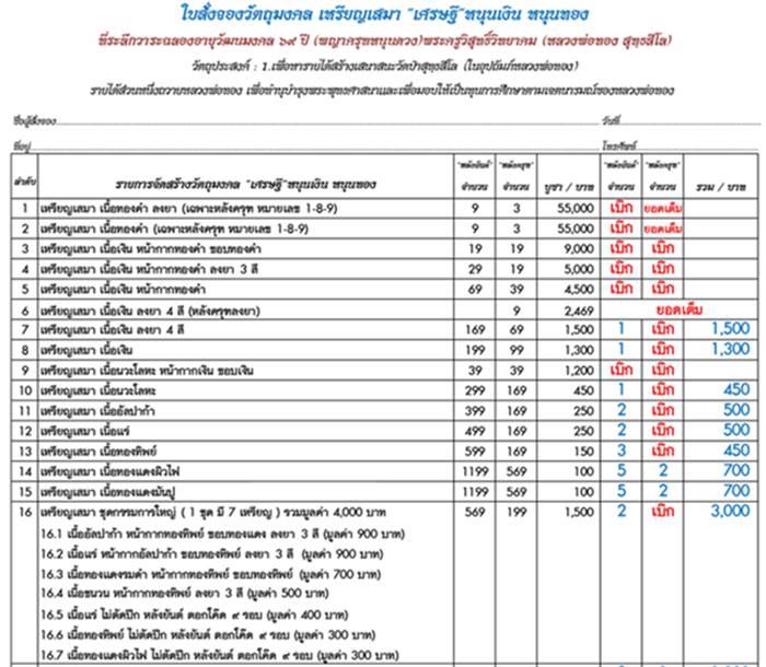วัตถุประสงค์ 1.เพื่อหารายได้สร้างเสนาสนะวัดป่าสุทธสีโล (ในอุปถัมภ์หลวงพ่อทอง)