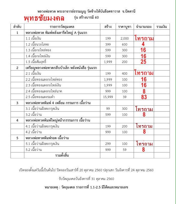 หมายเหตุ:วัตถุมงคล รายการที่ 1.1-2.5 มีโค๊ดและหมายเลข