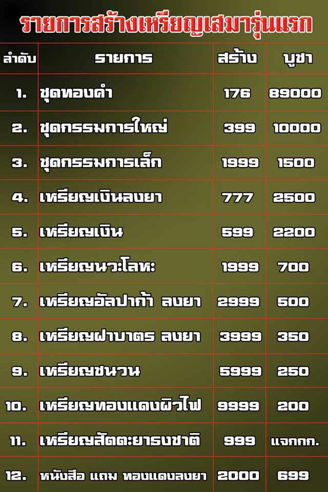 - เหรียญเนื้อสัตตะลงยาธงชาติ ราคา 2,400 บาท มี 10 เหรียญ