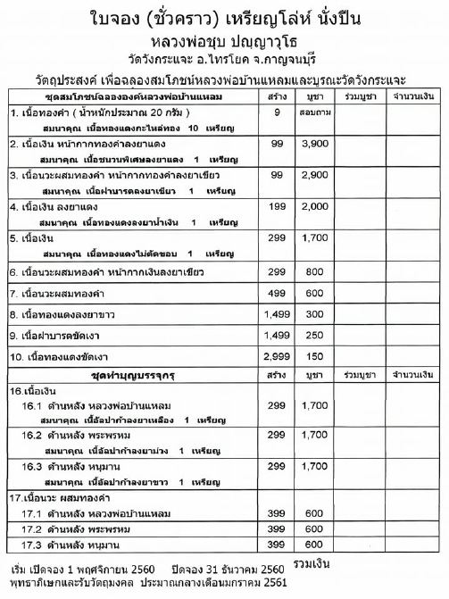 ๕ เนื้อเงิน (แถมทองแดงไม่ตัดขอบ ๑ เหรียญ) สร้างตามจองไม่เกิน ๒๙๙ เหรียญ มียอด ๑๐ เหรียญ บูชาเหรียญละ 1700 บาท