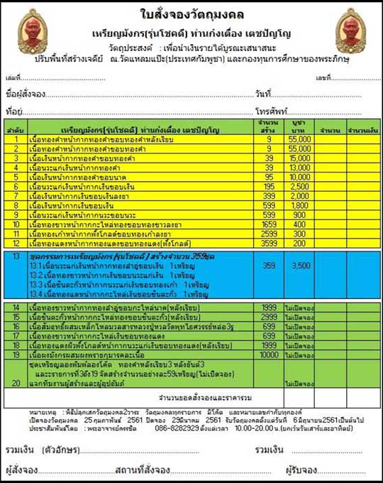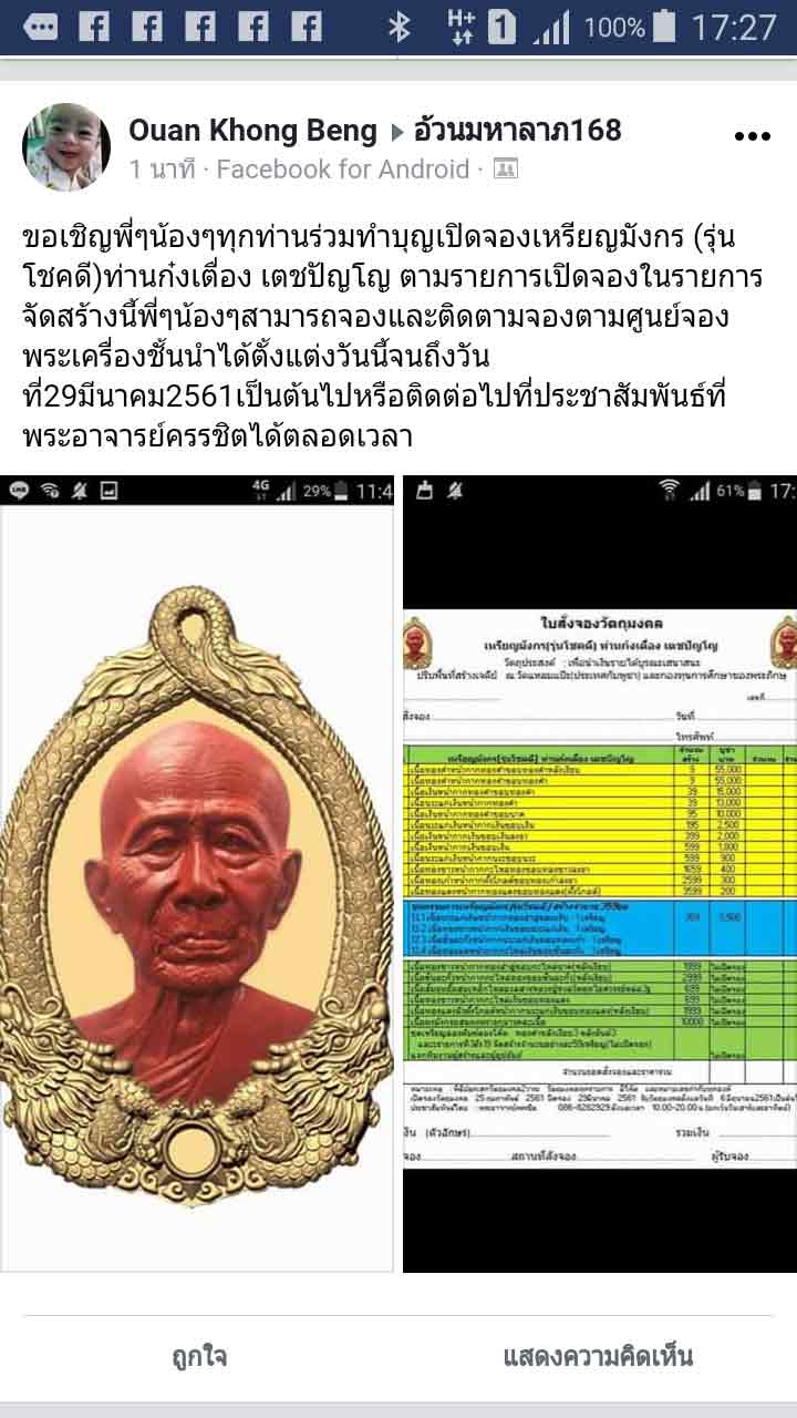 ขอเชิญพี่ๆน้องๆทุกท่านร่วมทำบุญเปิดจองเหรียญมังกร (รุ่นโชคดี)ท่านก๋งเตื่อง เตชปัญโญ ตามรายการเปิดจองในรายการจัดสร้างนี้พี่ๆน้องๆสามารถจองและติดตามจองตามศูนย์จองพระเครื่องชั้นนำได้ตั้งแต่งวันนี้จนถึงวันที่29มีนาคม2561เป็นต้นไปหรือติดต่อไปที่ประชาสัมพันธ์ที่พระอาจารย์ครรชิตได้ตลอดเวลา